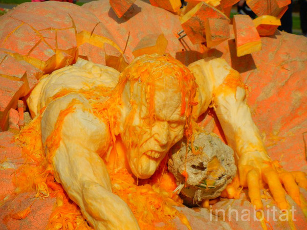 這些栩栩如生的「南瓜殭屍雕刻」使勁張著雙手,就像要從南瓜殼中的地獄逃脫出來般;在維拉凡神乎其技的巧手下,南瓜肉化為血淋淋的腦漿、血肉,還「牽絲」留在殭屍的頭顱上,展現另類的黃澄澄恐懼。