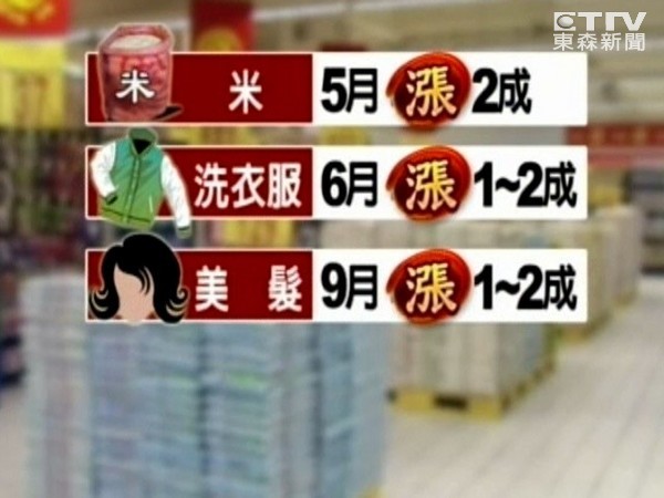 據統計,目前已經漲價的包括奶粉、冷飲、小吃等22類、64種品項漲價,其他物價也蠢蠢欲動。包裝米廠商透露,油電雙漲導致運輸費用增加,稻穀烘乾費用也增加,將視今年第一期稻作收割時的穀價進行價格調整。