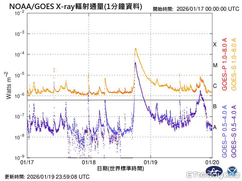 氣象署表示,受到太陽表面活躍區(AR4341)1月19日發生X1.9級長延時太陽閃焰,並伴隨著顯著的日冕物質拋射事件(CME),於1月20日凌晨通過近地太空環境,造成行星際空間中的太陽風風速及密度明顯增加,依據NOAA WSA-Enlil模式資料分析,預估地磁擾動將有明顯增強並持續影響約36小時,最大規模可能短暫達到劇烈磁暴等級(Kp=9, G5)。
