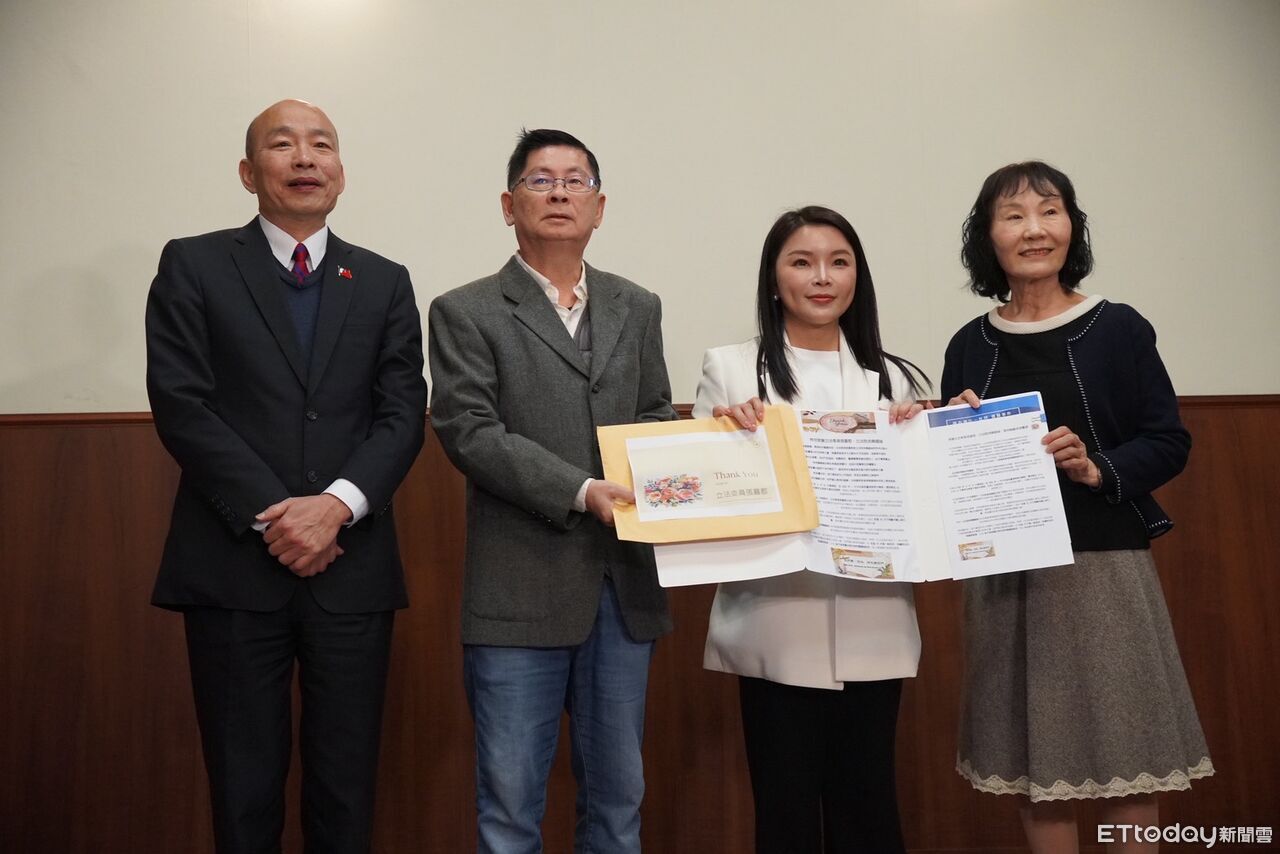 ▲立法院長韓國瑜與立委張嘉郡,於立院接見滯留阿布達比返台的雲林陳姓夫婦。(圖/張嘉郡辦公室提供)