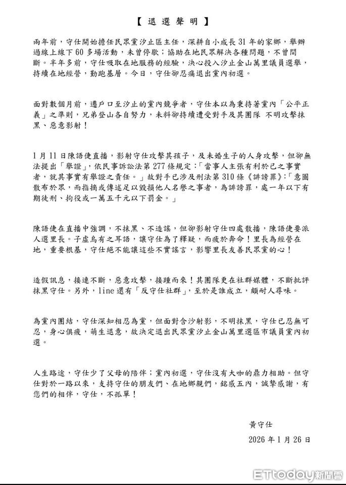 有意投入新北金山萬里議員選舉的民眾黨汐止區主任、黨代表黃守仕今(26日)發出退選聲明,文中點名遭到主席黃國昌四金釵之一的「陳語倢」抹黑影射,她指出,1月11日陳語倢直播,影射她攻擊其孩子,及未婚生子的人身攻擊,但卻無法提出「舉證」,其團隊更在社群媒體,不斷批評抹黑,自己已忍無可忍,身心俱疲,故決定退出議員黨內初選。
