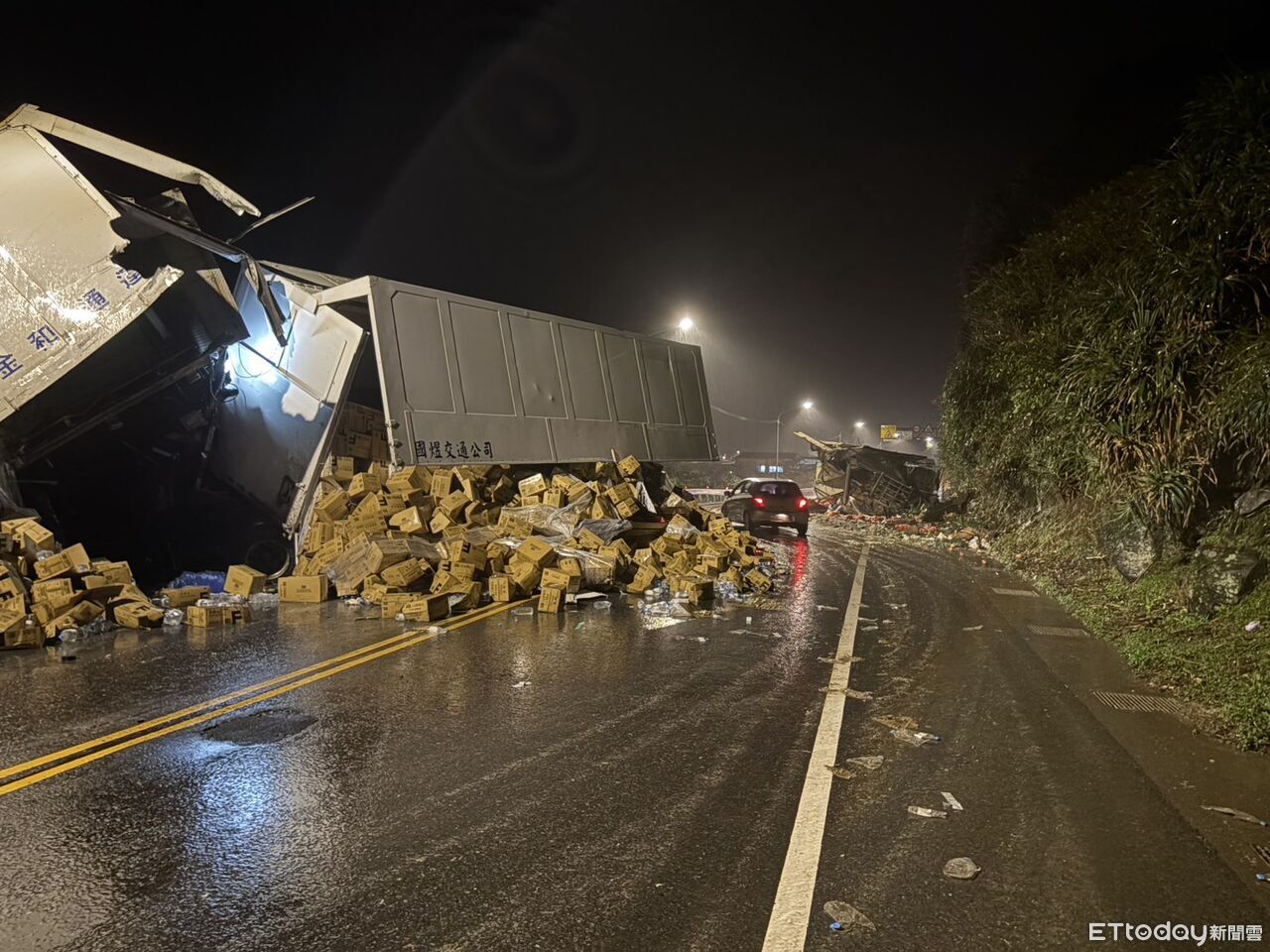 新北市貢寮區台2線105.5公里處(基隆往宜蘭方向)27日深夜10點發生車禍,兩輛貨運聯結車在該地點發生擦撞,導致載運的貨櫃當場翻覆,裡面裝載的青菜、礦泉水散落一地。警方趕到後,立刻疏導交通,目前單線雙向通行,交通未中斷,詳細事故原因、是否有人員受傷均待釐清。