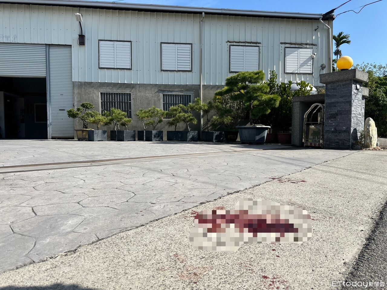 附近工廠門口可見,有一大灘血跡,出血量不少,一旁還有點點血跡,李師頸部傷口應非常深。