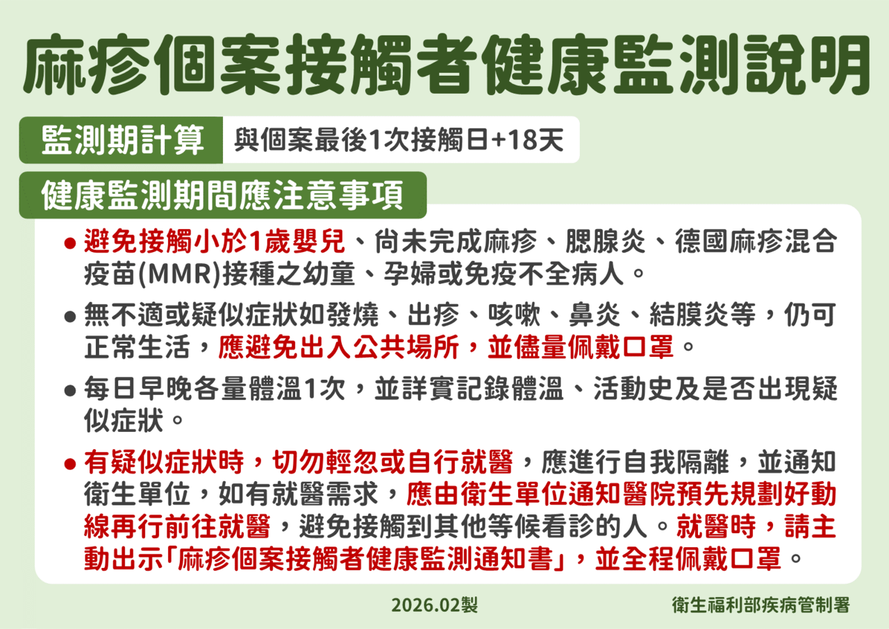 疾管署提醒,麻疹傳染力非常強,如與確診個案有相關接觸史或已經地方衛生局通知受匡列為接觸者,務必遵循「麻疹個案接觸者健康監測通知書」所示,確實做好健康監測及防護措施,如出現疑似症狀,應戴上口罩並自我隔離,儘快聯繫衛生局安排就醫,切勿輕忽或自行就醫。