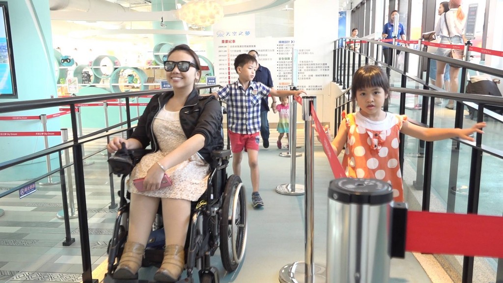 這天,輪椅部落客林欣蓓來到麗寶樂園搭乘全台最大的摩天輪,這裡有專為行動不便者提供的斜坡板,讓坐著輪椅的欣蓓方便進去摩天輪車廂裡乘坐,她興奮的說,這邊的摩天輪門口寬度很寬,所以輪輢可以進的去,而且工作人員也會提供活動式的斜坡,讓她可以看到非常漂亮的風景,實現夢想!