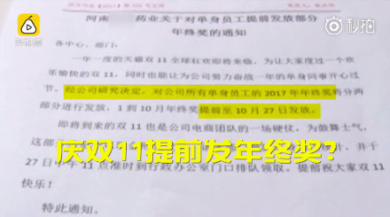 綜合陸媒報導,河南鄭州一間電商公司為了讓單身員工歡慶雙11,特別在內部張貼公告,將對所有單身的人提前發放1到10月的年終獎金。公司表示,即將到來的光棍節是電商團隊的一場硬仗,為鼓舞士氣,獎金將以現金形式發放,還要各部門做好「單身員工統計」,讓所有單身的同事也能過一個開心的雙11。