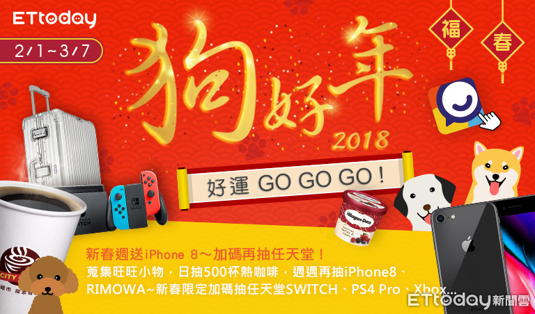 咚咚隆咚鏘!農曆新年要到了!這時就是要來試試手氣呀!然而除了買彩卷外,《ETtoday新聞雲》App連續5周也舉辦了「狗好年~好運GOGOGO!」活動,除了日日抽500杯暖心療癒熱咖啡,還祭出周周抽好禮,包含4支iPhone 8、3個RIMOWA行李箱、80張威秀影城電影票、120個哈根達斯冰淇淋等;甚至在新春限定期間還有刮刮樂加碼抽,不論是任天堂SWITCH,或是PS4 Pro、Xbox等遊戲大獎,通通要送給你啦!