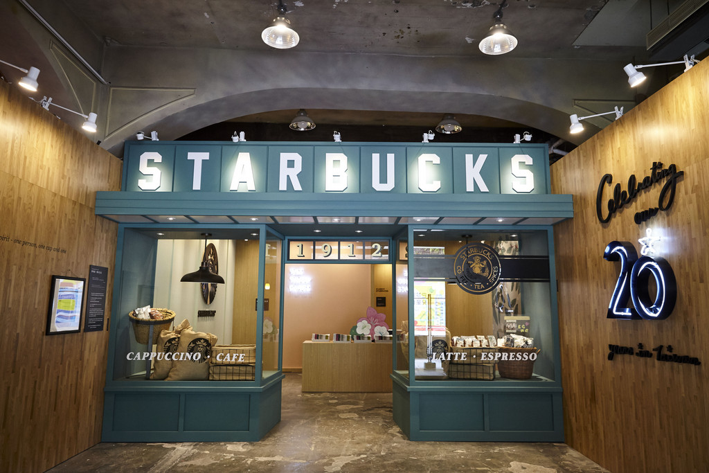 台灣星巴克店數已達435家,這裡可以瀏覽他們過去在台灣20年發展的品牌故事,主要是介紹經典店門的裝潢風格,同時簡單陳列桌椅塑,用地、火、水、風賦予空間層次感,塑造喝咖啡的情境。