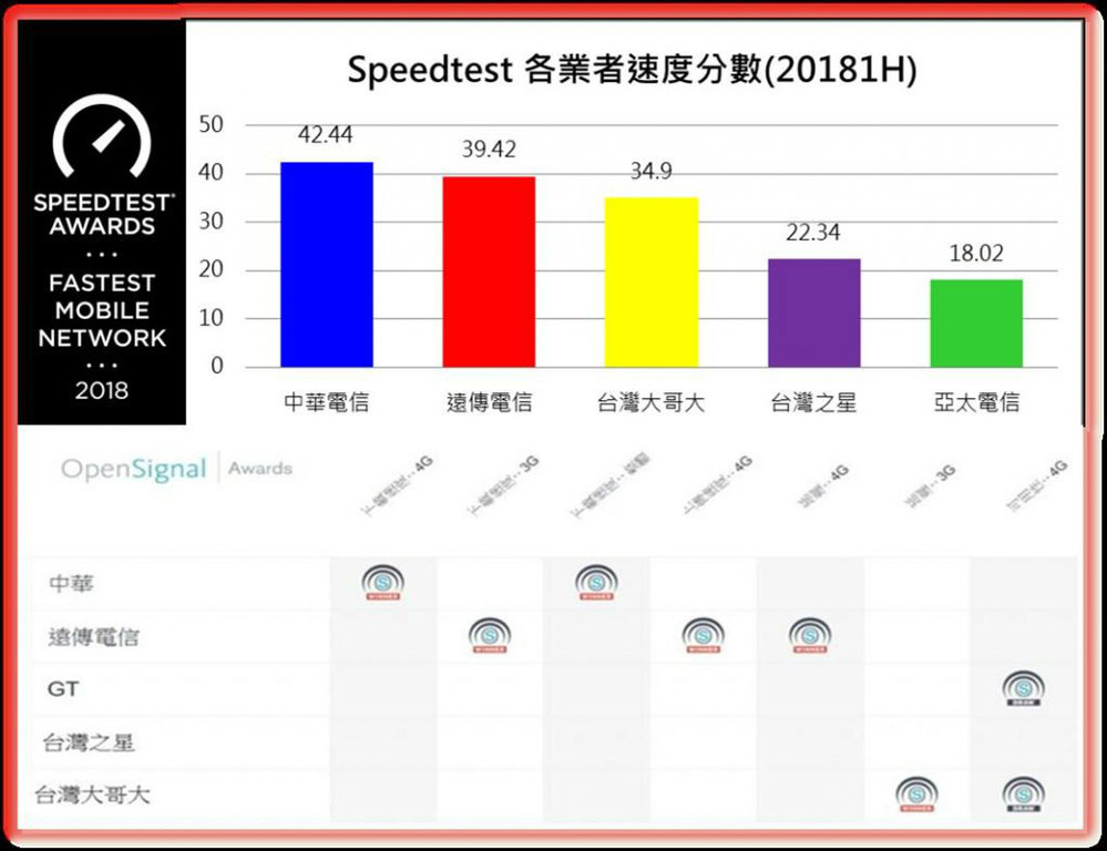 在Speedtest綜合各項速度指標所計算出來的速度分數,中華電信以42.44分居冠、遠傳電信以39.42分居次、台灣大哥大、台灣之星與亞太電信各以34.92、22.34、18.04落後。