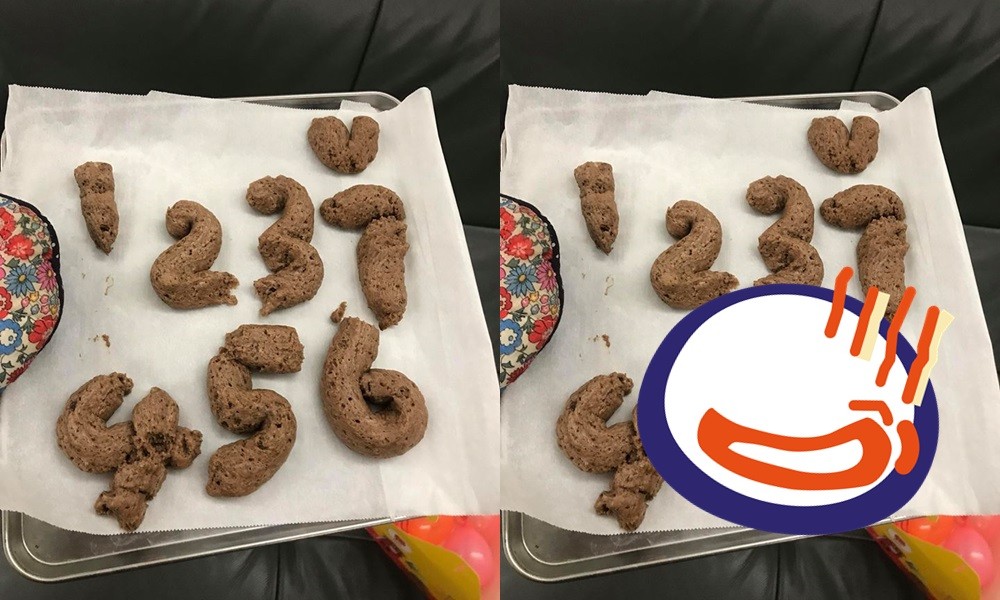 仔細看看照片,原PO的兒子在烤盤上用麵糰寫出數字1至7,但因為麵糰是咖啡色,又混有空氣,烤出來的成品坑坑洞洞,條狀的樣子看起來就像大便,難怪讓女網友食慾全無。