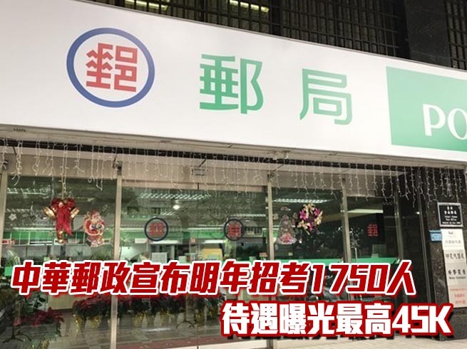 中華郵政宣布108年將公開甄選職階人員正取1,750名、備取545名。甄試作業委由台灣金融研訓院承辦,預定自108年1月16日上午10時起至28日下午5時止採網路報名。職缺包含營運職、櫃台內勤、郵遞外勤等,月薪最高4萬5,210元。
