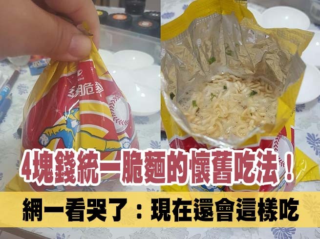 一位網友在臉書「爆廢公社」中貼出2張照片表示,「小時候這樣吃過的舉手!」只見圖中有一包統一脆麵,但是他卻不是直接捏碎乾吃,而是用熱水泡開變成湯麵。原po表示,以前爸爸每天都會給他10元,下課後到雜貨店買一包4塊錢的點心麵,老闆娘還會準備好熱水,吃飽後再走上4公里的路回家。