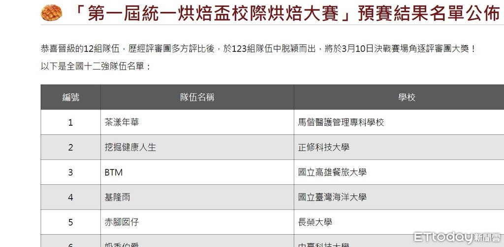 ▲統一烘焙盃校際烘焙大賽「12強」預賽結果公布於統一烘焙盃校際烘焙大賽官網。(圖/記者林悅翻攝)