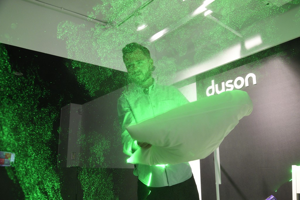 ▲你知道久未清潔的床單或枕頭,裡面潛藏著多少塵蹣呢?Dyson新品設計工程師Sam Railton輕輕一拍枕頭,在雷射光照射下,被拍打出來的塵蹣無所遁形,更可怕的是,數量多到滿佈在整個空氣中。(圖/記者湯興漢提供,以下同)