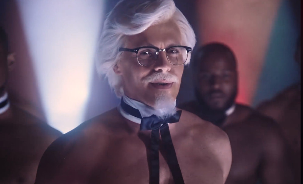 肯德基在FB上公開最新MV,約1分鐘長的影片上架還不到一天,就吸引75萬人觀看。只見桑德斯上校帶著9位猛男,露出胸肌,身穿黑色西裝褲,脖子上還繫著可愛的小領結,在鏡頭前大跳性感舞蹈,最後還一把扯掉黑色西裝褲,露出屁股後面的促銷標語,並扮成「人體雞桶」大喊「Happy mother's day(母親節快樂)」。