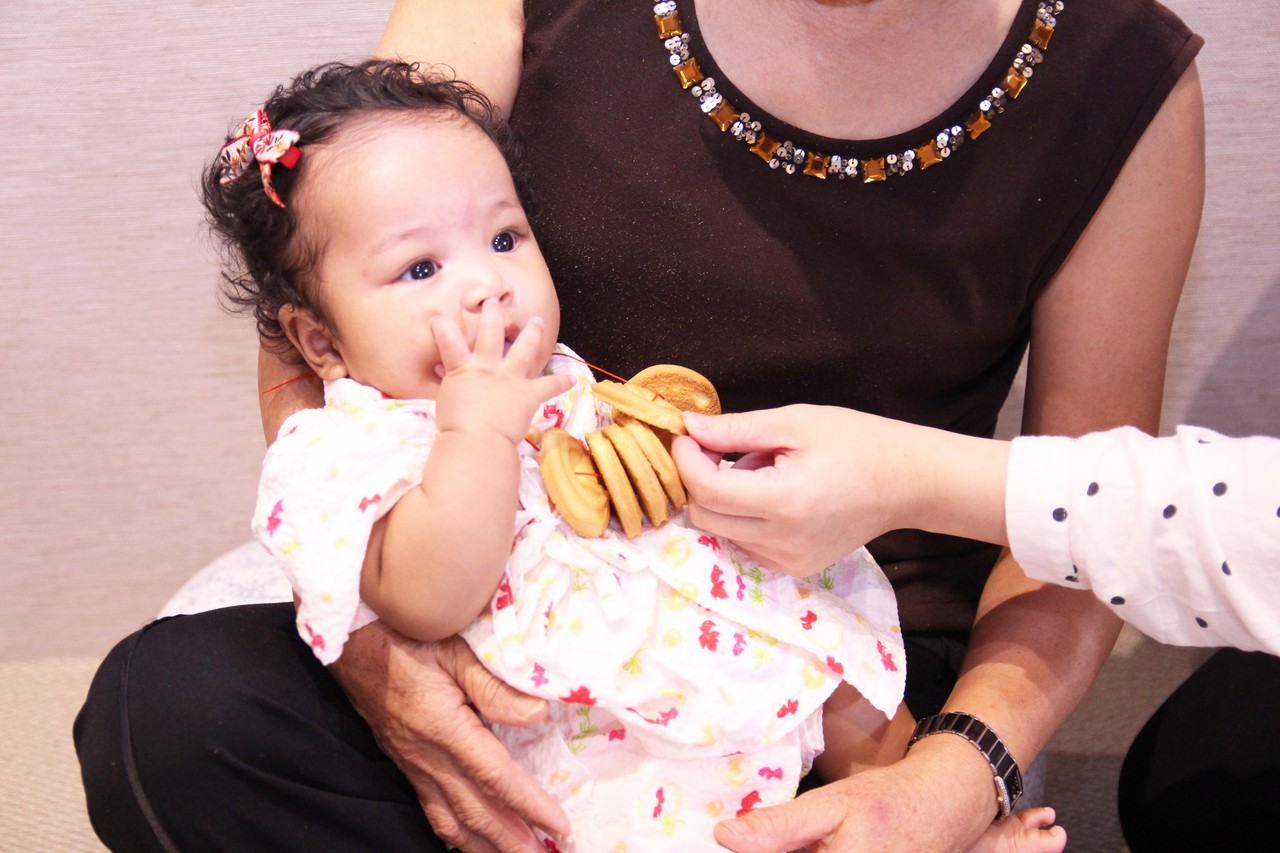 日本Combi直效行銷經理華欣補充,除了大家熟悉的中式傳統收涎流程、Combi更融合了日式傳統文化中非常獨特的「初食宴」內容到活動中。蛤湯、鹽燒鯛魚、燉菜、石頭這些豐富且有意義的餐餚,各自都代表著期待給予孩子的祝福。蛤湯是希望孩子在未來的日子裡,能夠遇到像雙殼類動物一樣完美匹配的對象;鹽燒鯛魚的日文發音則有類似裡恭喜、吉祥的寓意、燉菜中的根莖類蔬菜有「以耐心和力量去成長茁壯」深遠含義、石頭則是祝福孩子接下來能夠長出如石頭般堅固的牙齒。