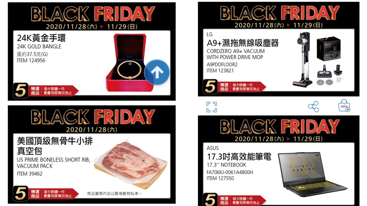 好市多「黑五限定」第6天精選優惠商品先看,有LG A9+濕拖無線吸塵器、ASUS 17.3吋高效能筆電、24K黃金手環、美國頂級無骨牛小排真空包等。