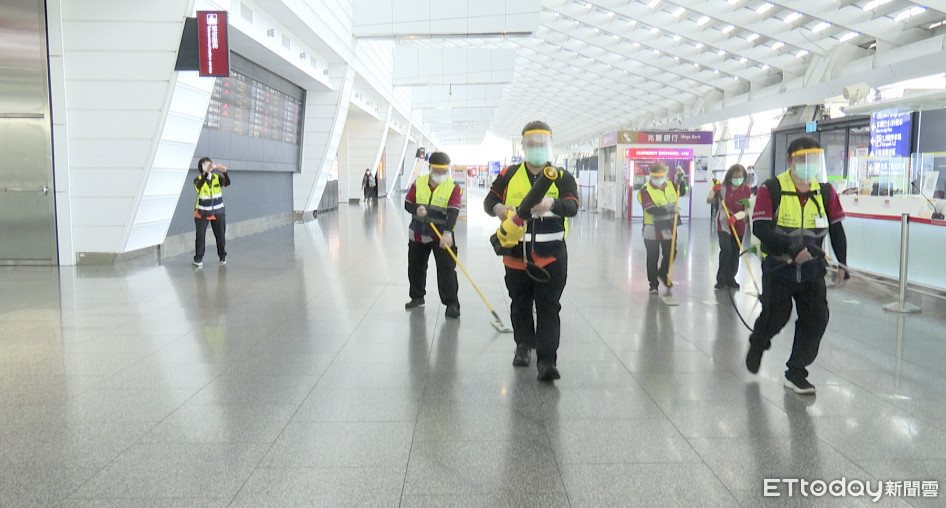 ▲清潔人員大陣仗仔細消毒,每個小時就會清消一次。(圖/記者張凱喨攝)