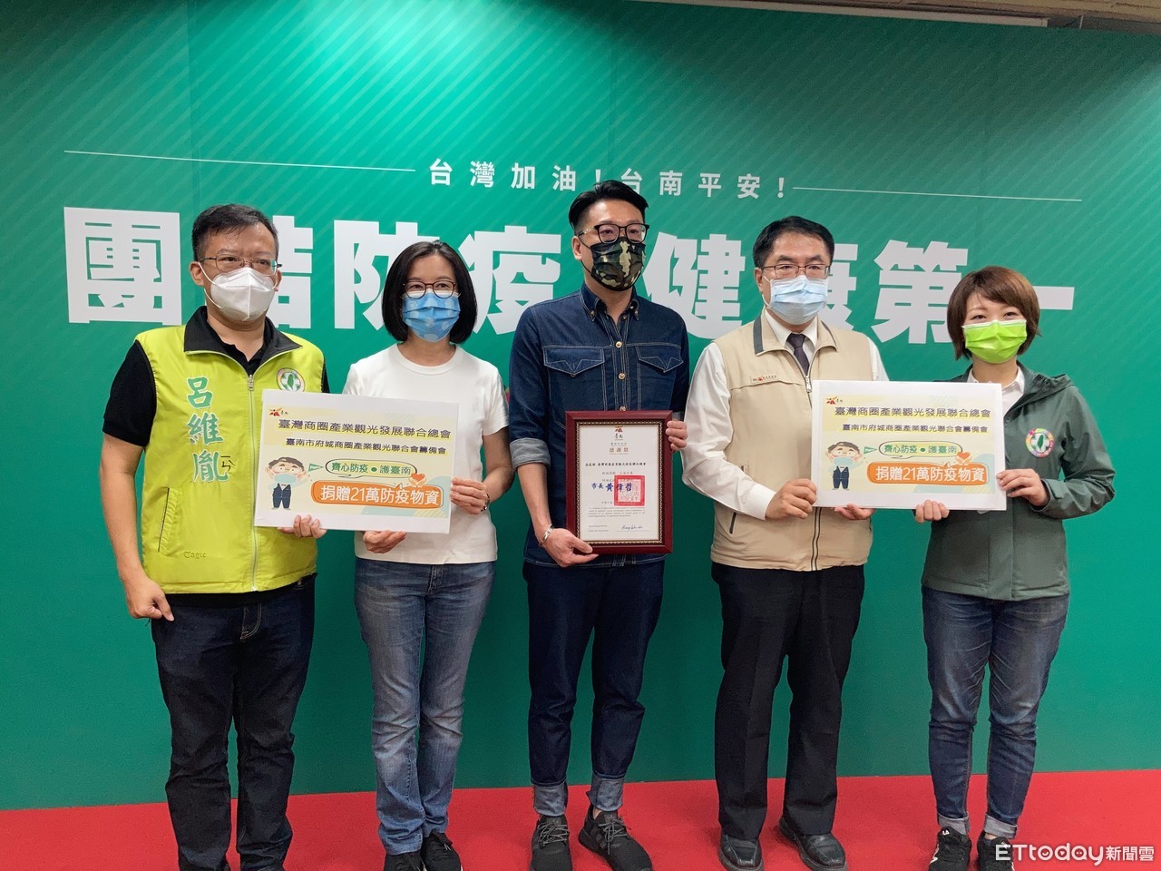 台灣商圈產業觀光發展聯合總會及台南市海安觀光商圈發展協會,捐贈新台幣21萬元予社會局救助金專戶,做為購買防疫物資之用,22日由聯合總會副總會長黃睿勲代表捐贈,市長黃偉哲代表受贈並致贈感謝狀。
