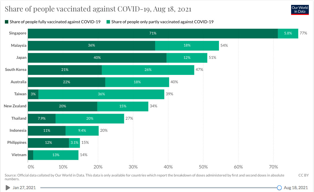 根據截至8月18日的統計,美國至少完成一劑疫苗接種的達60.6%,完整接種的有51.5%。日本的接種率稍低,接種一劑有50.1%,完整接種的有39.1%。台灣完成一劑接種的有39.2%,完整接種的只有3.0%。完整接種的超低比率,在鄰近國家中只高於越南。菲律賓是12%,印尼11%,南韓20%。