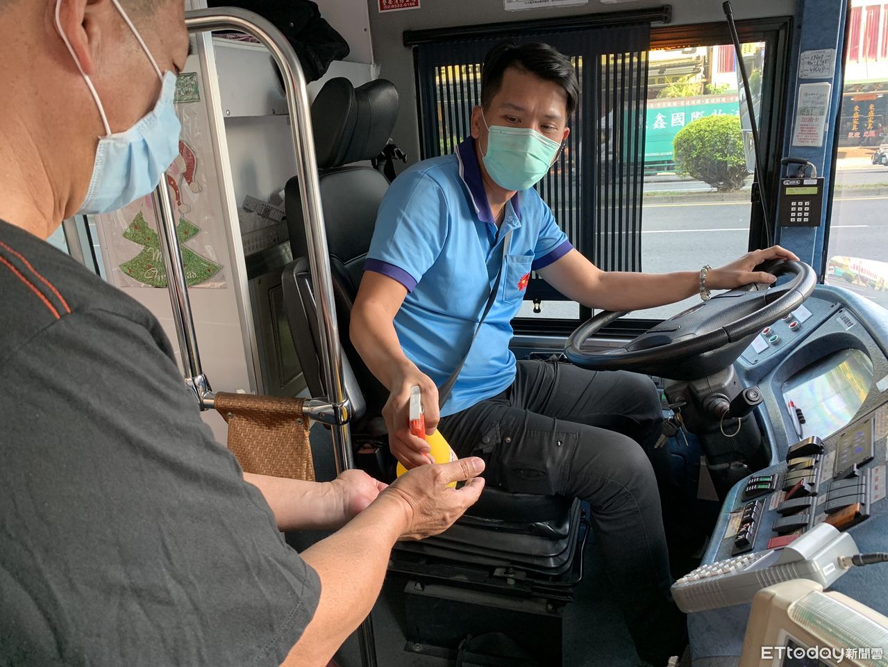 ▲行經長庚、高醫、榮總等12家指定隔離醫院公車路線及疫情爆發區域公車路線,駕駛提供乘客手部噴灑酒精消毒服務,同時車輛加強清消。(圖/高市府交通局提供)