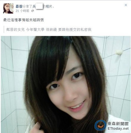吳女10日在臉書(Facebook)上寫道,「鄰居的女兒今年聲(應是升)大學很缺錢要跟他援交的私密我。」