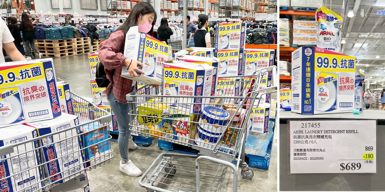 隨著疫情升溫,有效自主管理、保護自己也保護他人已成民眾共識。向來採買人潮不斷的美式賣場,儘管採買人潮依舊不少,但也發現民眾自主保持防疫準則,購物車內容也可看出多採一次購足的採買策略。其中也發現,許多人都拿了日本夯品ARIEL抗菌洗衣精。原來是日本ARIEL洗衣精祭出4/22~5/5限時特價,一箱折價180元(線上購物也同步折價,運費另計)。與病毒共存已經成為現代人的日常,如何不把病毒帶回家做好個人防護,是維護全家人健康的重要一環。許多人一回家就會將衣物全部拿去洗,換上乾淨的家居服,家中待洗衣物量暴增之外,洗衣精的用量也大增。美式賣場選在這時間祭出ARIEL洗衣精特惠,也讓民眾直呼「太好了!正需要補貨」、「終於特價了,立馬去搬了10箱」。