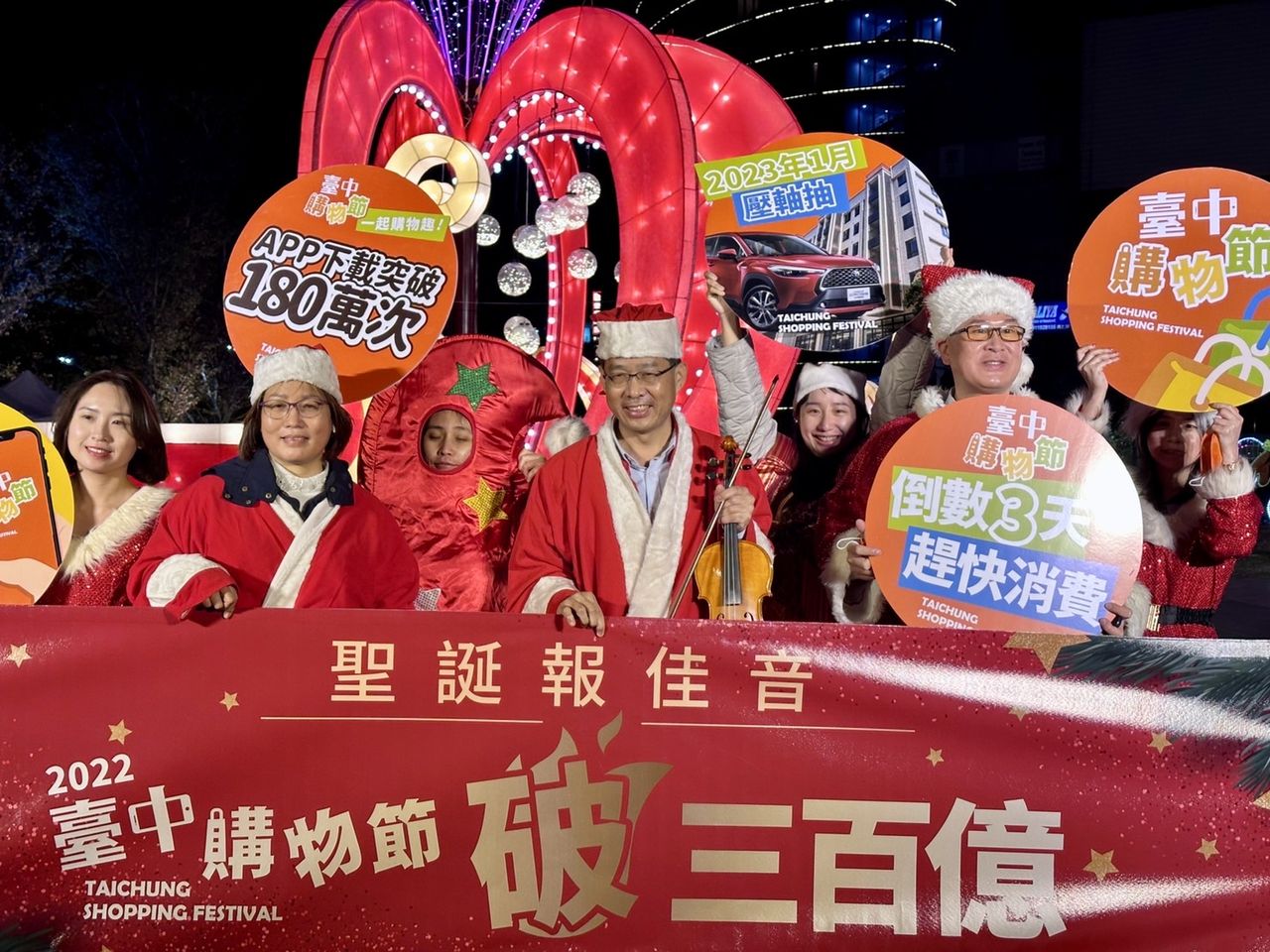 台中市政府經濟發展局慶祝台中購物節登錄消費金額截至12/20日已突破300億元,提前達成今年立下的目標,經發局長張峯源巧扮聖誕老人,於舉辦「2022台中耶誕嘉年華—台中好甜,心動於中」的台中火車站前廣場,帶領同仁分送糖果聖誕報佳音,同時宣布將於12月28日加碼抽1名百萬現金獎得主。值得一提的是,張局長自己也於當場幸運中獎,當下隨即將抽中的天天抽三千元,全數捐贈台中市社會救助金專戶,讓喜氣更有意義。
