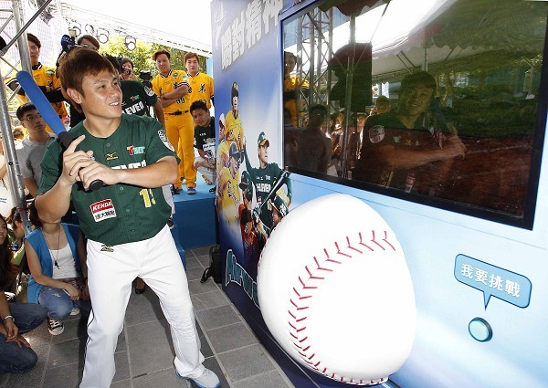 ▲左起陳鴻文、周思齊、彭政閔、陳鏞基、潘武雄、潘威倫六大職棒明星熱情參與『Airwaves 嚼對精神 放手一擊之全壘打大賽』!
