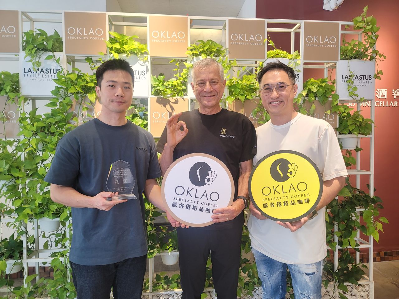 ▲(由左至右)歐客佬精品咖啡長期培養的咖啡師「張維欣」獲2024世界盃虹吸咖啡大賽冠軍、Lamastus第三代莊園主Wilford Lamastus、歐客佬精品咖啡執行長王信鈞。
