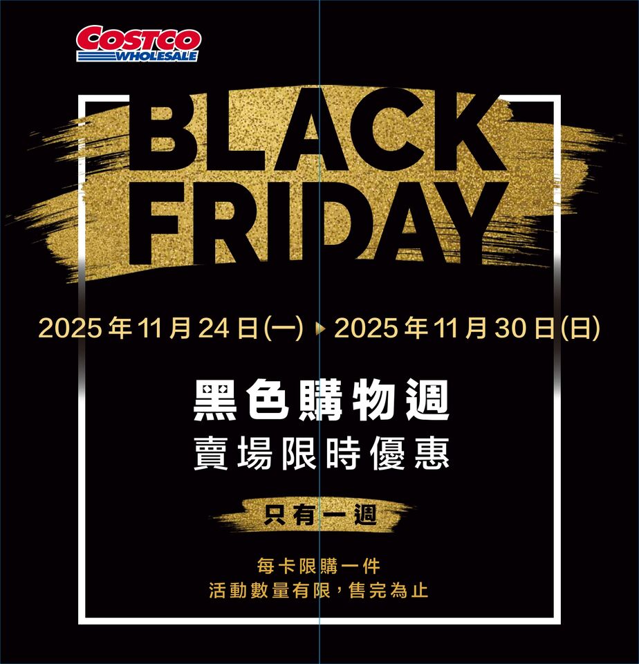 好市多宣布一年一度「黑色購物節」(黑五購物節)今年舉行時間為11月24日至30日,將有數百項商品祭出下殺優惠。按照往年流程,商品及折扣將保持神秘,前一天將於好市多社群、APP曝光隔日亮點優惠品項,不過折數和售價仍會在賣場揭曉。