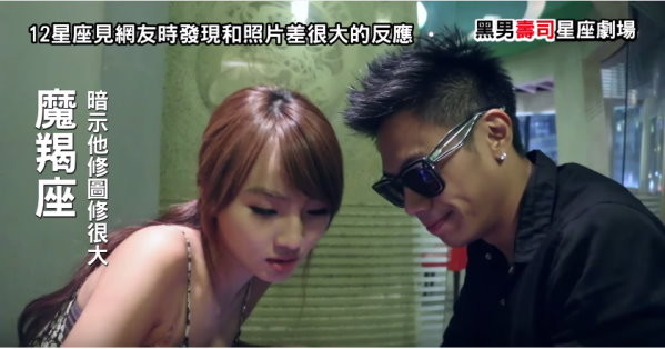 網路紅人黑男和壽司最近拍攝了一段影片,名為「12星座見網友時發現和照片差很大的反應」,用來剖析每個星座的人,如果見到網友本人與照片差很大時,他們的反應究竟是如何?有人會消遣、有的則是當場翻臉,也有人則會找藉口離開,以下就是各星座面對網友和本人差很大時所呈現的反應。