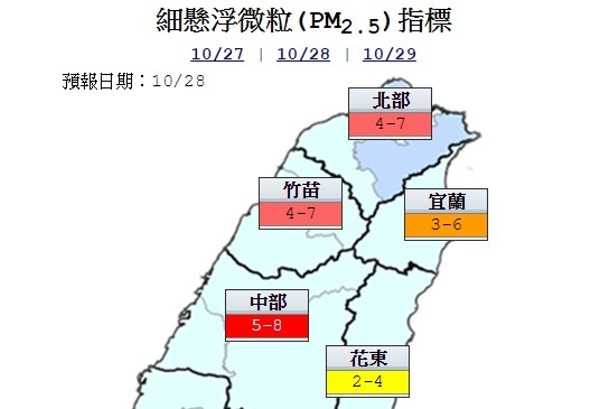 根據環保署「空氣品質監測網」的資料顯示,本島27日PM2.5指標除中部來到7為高等級(7到9),其他地方為中等級(4到6);28日北部、竹苗、中部和雲嘉南來到高等級,其中中部更衝到8。