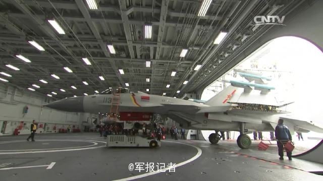 中國大陸航母「遼寧號」日前出海訓練,新一批「殲-15」戰機完成觸艦復飛、阻攔著艦等課目訓練,官方媒體也曝光了遼寧號機庫內部,以及殲-15移出準備起飛的畫面。(上圖/取自「軍報記者」微博/央視網,下同)