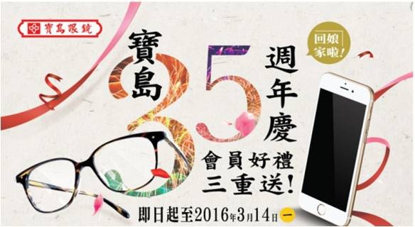 活動期間前往活動網站(https://goo.gl/uklRlk)或到全台「寶島眼鏡」門市,消費者只要選擇加入會員,或更新以前留在寶島眼鏡的客戶聯絡資訊,就可以參加「好禮三重送」活動,有機會抽中iPhone 6s智慧型手機、迪士尼限量眼鏡配件組…。