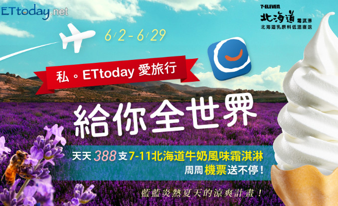 6月份迎接旅遊季,東森新聞雲APP特別從6月2日到6月29日推出一系列抽獎好康,只要每天瀏覽APP新聞,蒐集國旗圖示,就有機會天天抽中388支7-EVELEN北海道牛奶風味霜淇淋、抽20張海外旅遊機票、周周抽HIGH SIERRA28 吋行李箱,對於愛閱讀、愛旅行的民眾是絕佳機會;此外,每周依序送出北海道、長灘島、大阪來回機票,天天打開APP讀新聞、天天蒐集國旗,即刻充飽知識,馬上飛出國,盛夏冒險就從指尖開始環遊世界!