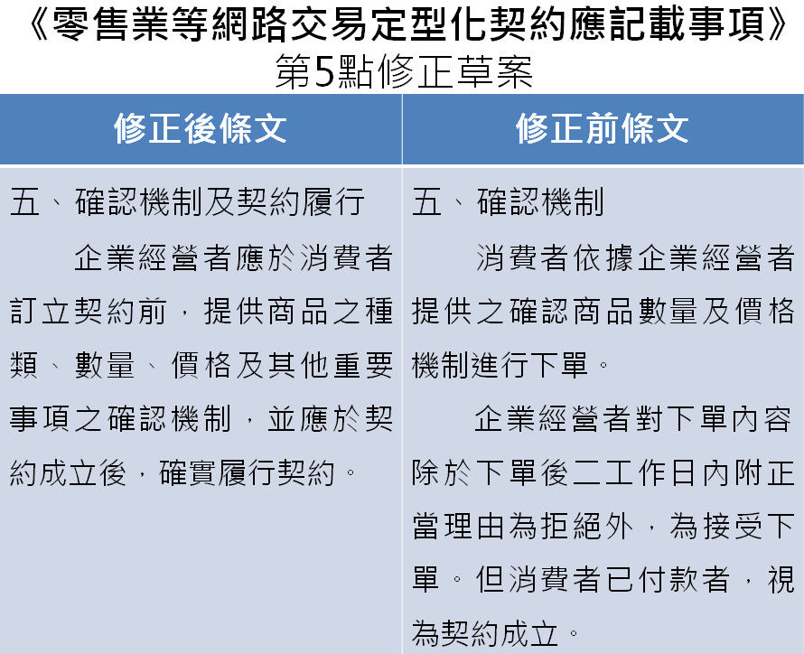 修正前規定消費者下單後,業者2日內若無正當理由拒絕,訂單契約就算成立,且當消費者一付款,契約也算成立了;然而修正後,企業經營者應於消費者訂立契約前,提供商品種類、數量、價格及其他重要事項的確認機制,並應於契約成立後,確實履行契約。