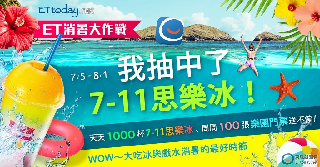 想喝杯冰涼的思樂冰,又想到遊樂園大玩一番,東森新聞雲APP幫你一次滿足兩個願望。此次東森新聞雲APP規劃了為期4周的「ET消暑大作戰」活動,期間將天天抽1,000杯7-11思樂冰,總計送近30,000杯給雲友之外,周周再抽六福村、麗寶樂園馬拉灣、麗寶樂園密室逃脫等門票,幫你省下門票錢,放暑假可以盡情衝向遊樂園玩耍。