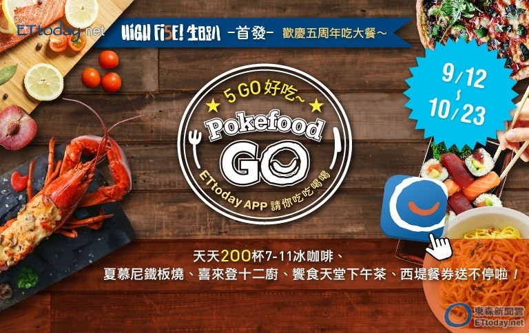 ETtoday邁入5周年啦!為了和雲友們一同慶祝令人開心的時刻,這次《ETtoday東森新聞雲》APP特別企劃「High 5生日趴」,9月12日起至10月23日期間,將祭出高CP值人氣美食請你吃吃喝喝,除了連續6周、天天抽200杯7-11冰美式咖啡,每周還會分別送出喜來登十二廚、夏慕尼鐵板燒、Tasty西堤牛排、饗食天堂等300張餐券,讓你成為真正的飽可夢大師!