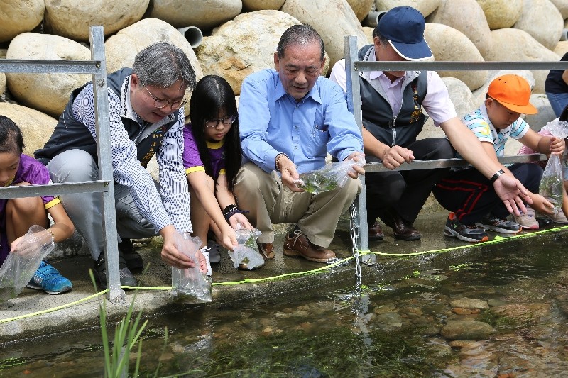 ▲台中市政府副市長(右3)林陵三與水利局長(左2)周廷彰在「台灣白魚回娘家-認識食水嵙溪」活動,和當地的國小學童、學者們,一同將復育的台灣白魚~放流在新社的食水嵙溪!(圖/台中市政府水利局提供,下同)