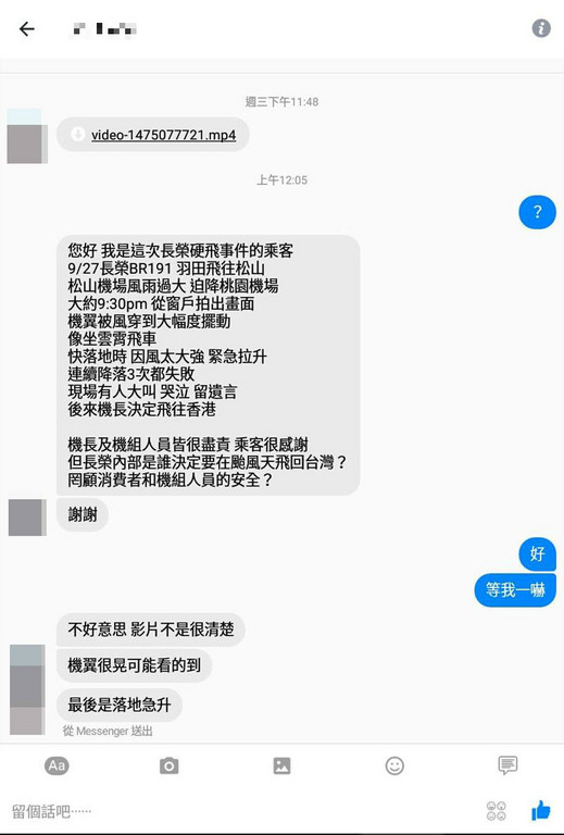 網友私訊「爆料公社粉絲團」表示,他是搭乘「長榮BR191」從羽田機場飛往松山的乘客,不過因松山機場風雨過大,最後迫降桃機;他說道,「機翼被風穿到大幅度擺動,像坐雲霄飛車,快落地時因風太強,緊急拉升,連續降落3次都失敗」。
