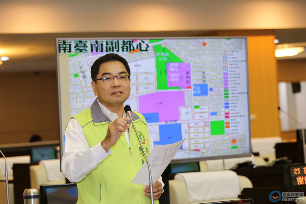 ▲台南市議員陳金鐘,在市議會總質詢時,提出救小巨蛋原址3方案。(圖/市議會提供)