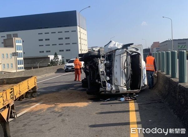 46歲賴姓男子駕駛砂石車行經桃園市台61線南下41公里處時,打算從外側車道切至內側車道時,因車輛打滑撞上前方內側車道之小貨車,導致小貨車翻覆扭曲變形,被砂石車夾在內側護欄間,38歲郭姓駕駛受傷送醫。警方獲報到場進行交通疏導並實施酒測,雙方駕駛酒測值為0,詳細肇事原因待後續調查釐清。