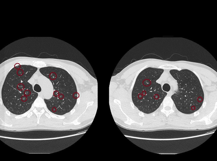 影像顯示,其肺部呈現「滿天星」狀態,布滿上百顆肺結節,且其中九成五以上皆為高風險的毛玻璃肺結節。