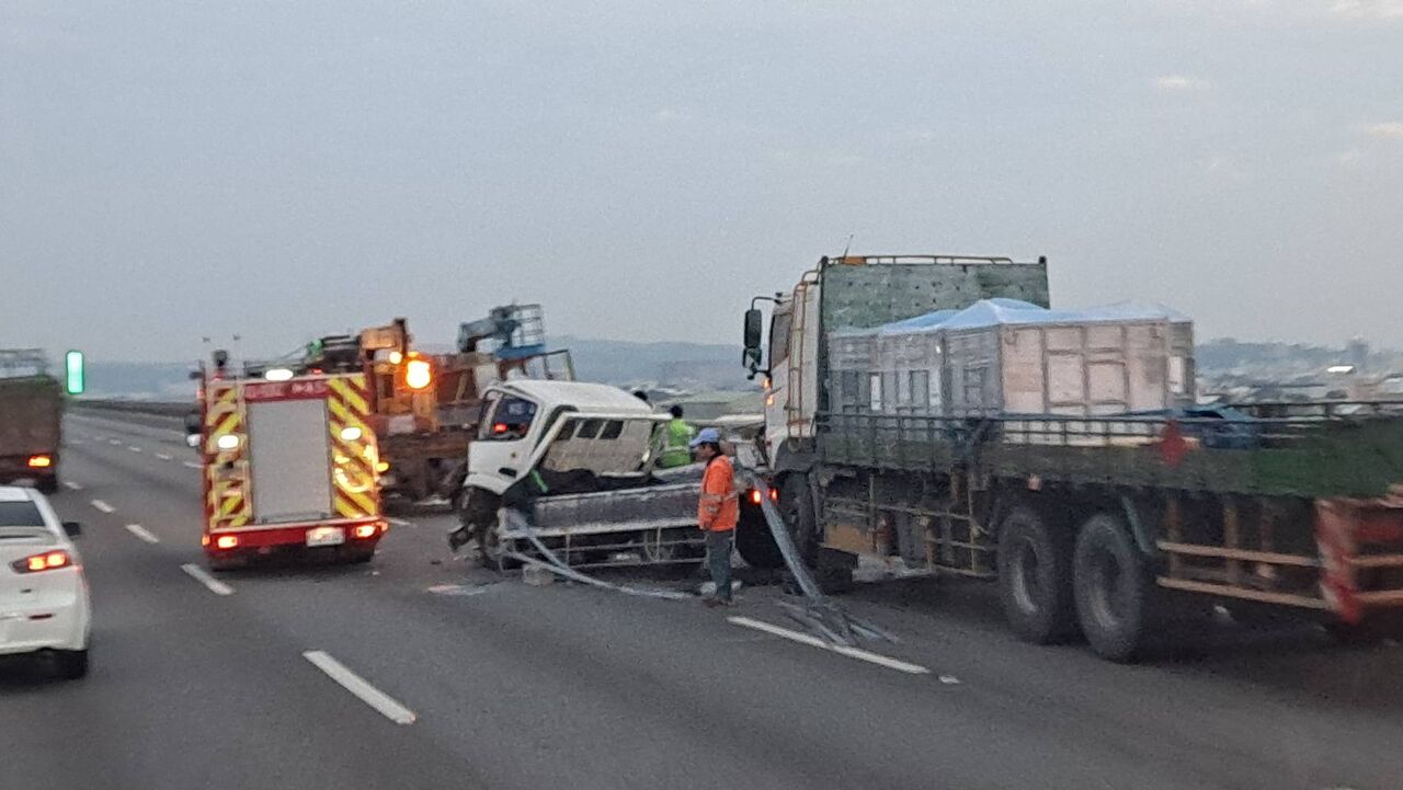 這起事故發生在下午5點多,國道三號194公里南下、靠近彰化和美的路段。現場一片狼藉,初步了解,共有5輛車發生追撞,其中最嚴重的是一輛白色貨車,它在撞擊後車身下陷變形,整輛車卡在現場無法動彈。車內一名男性駕駛與一名女性乘客因此受困,動彈不得。
