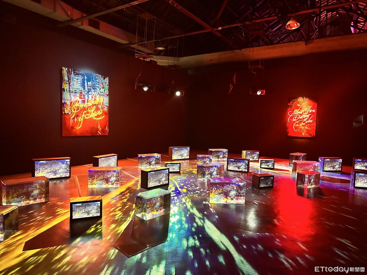 觀眾踏入展場,首先進入《生命的呼吸》,透過霓虹燈光與水箱裝置呈現都市生命的流動感,有台北站首度亮相的《生命的殘骸》,以層層垂落的花朵布幔,交織出新生與凋零的對照,探討記憶與生死的邊界。