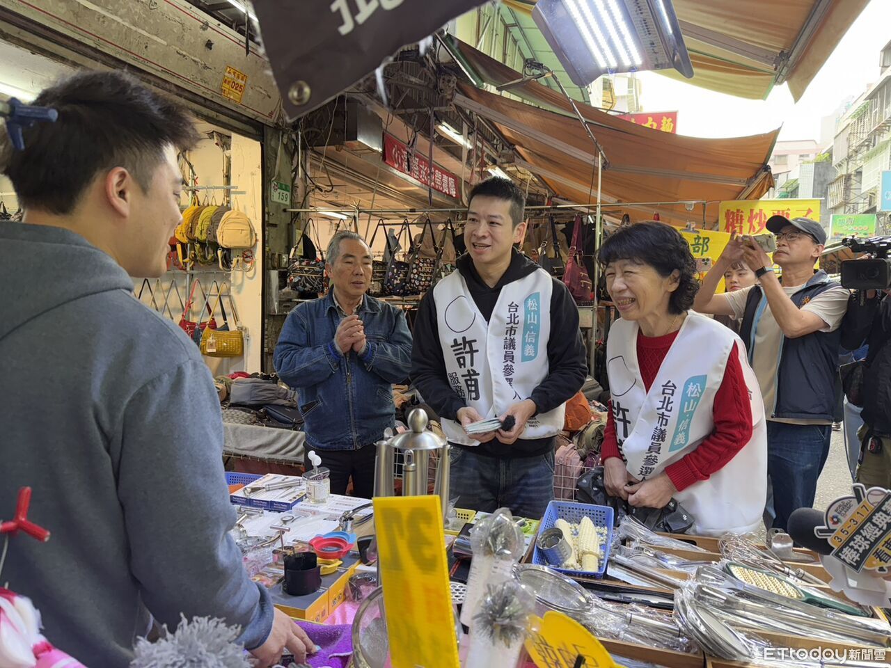 ▲民眾黨創黨主席柯文哲妻子陳佩琪陪同北市議員擬參選人許甫掃市場。(圖/記者陳家祥攝)