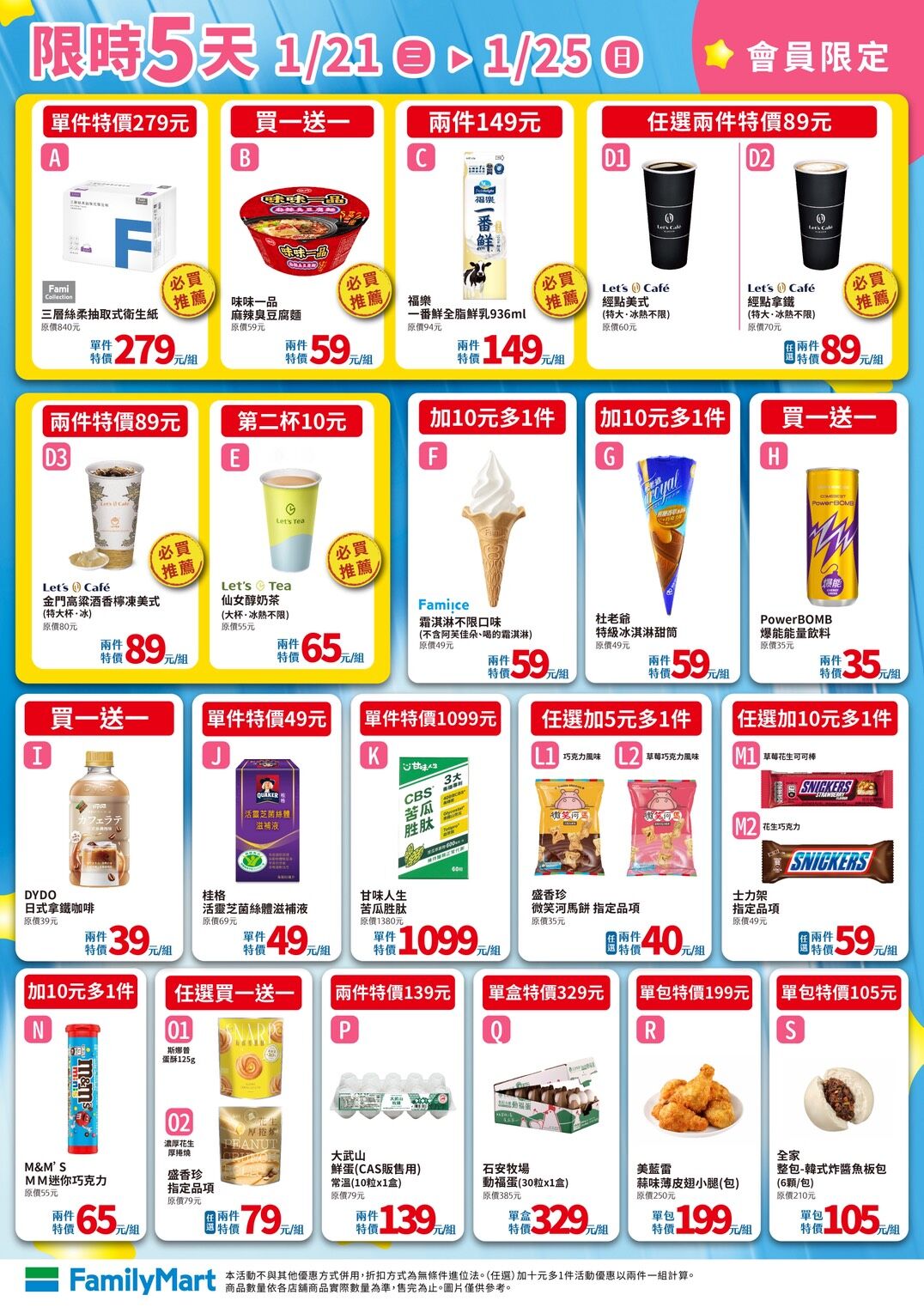 全家1月21日至1月25日推出「會員限定」優惠。咖啡與茶飲方面,Let’s Café特大經典美式、經典拿鐵,冰熱不限,祭出「任選2件特價89元」,金門高粱酒香檸凍美式同樣「2件89元」;Let’s Tea特大仙女醇奶茶「第2杯10元」。