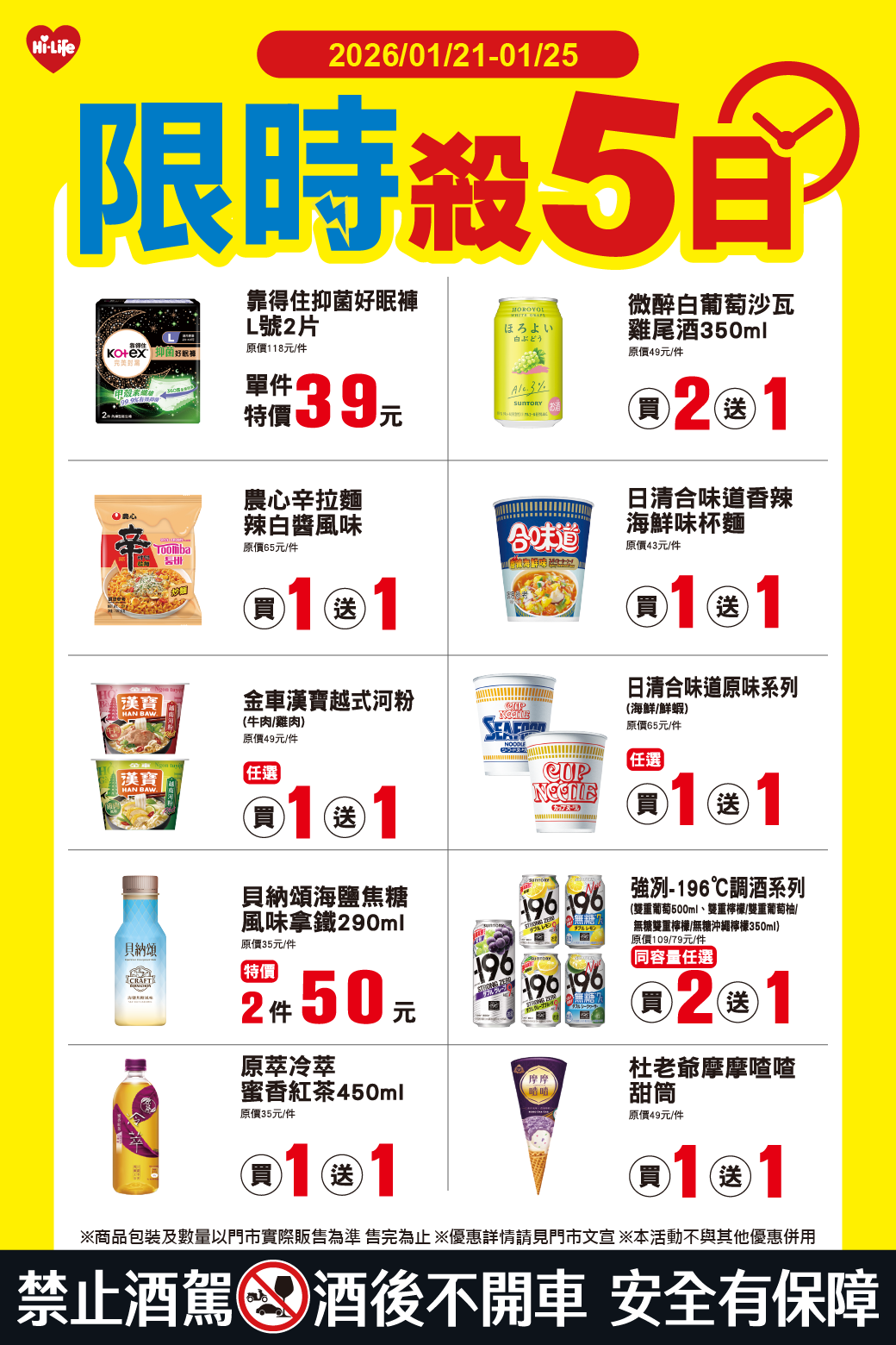 萊爾富於1月21日至1月25日推出「限時殺5日」優惠,農心辛拉麵辣白菜風味、日清合味道香辣海鮮杯麵皆推出「買1送1」;金車漢寶越式河粉(牛肉/雞肉口味)與日清合味道原味系列(海鮮/鮮蝦)「任選買1送1」。