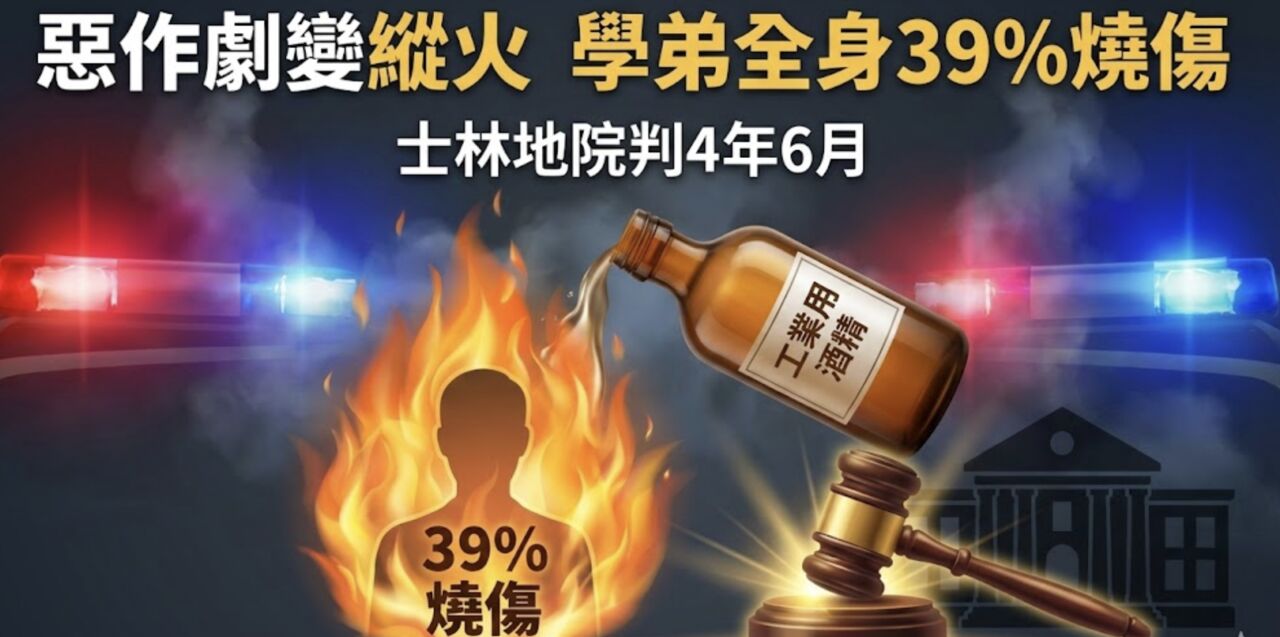 北市19歲曾姓男子與同校學弟聚會飲酒時,竟因酒後嬉鬧,拿起消毒酒精潑灑對方身體,甚至將酒精倒進衣領與褲頭縫隙,再以打火機點燃,導致學弟全身多處嚴重燒燙傷,皮膚功能永久喪失。士林地院審理後依傷害致重傷罪,判處有期徒刑4年6月,全案仍可上訴。